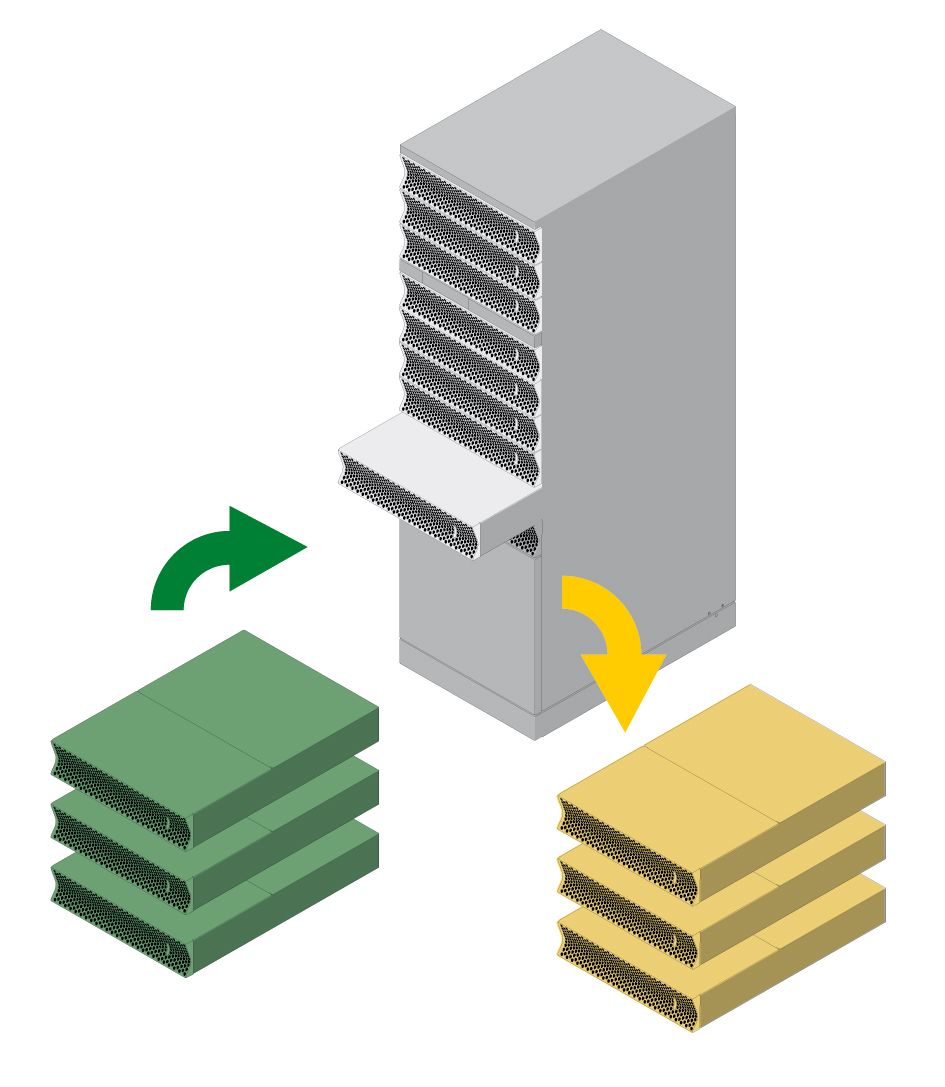Din acest motiv, sistemul a fost proiectat pe baza unei arhitecturi a dulapurilor fără componente electronice, ceea ce permite modulelor conectabile independente, de alimentare, control sau comunicare, să fie înlocuite sau actualizate în siguranță, în timp ce UPS-ul rămâne complet funcțional.